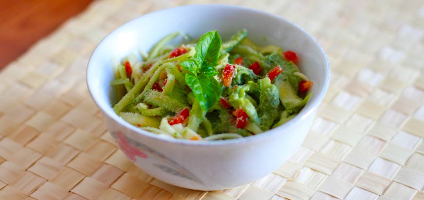 - Se amesteca sosul cu pastele de dovlecel si cu ardeiul taiat feliute si se serveste cu parmezan sau fulgi de drojdie deasupra.