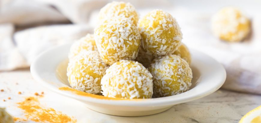 Bogate in proteine, fibre, carbohidrati cu absorbtie lenta si antioxidanti, aceste bilute aromate si racoritoare cu lamaie si turmeric sunt excelente inainte de sport, insa le puteti consuma cu placere si ca gustare sau desert: