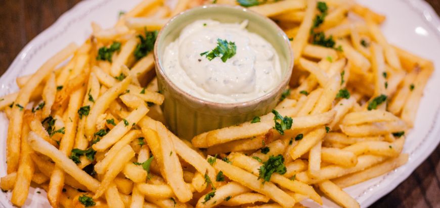 Se taie cartofii in felii rotunde de maxim 1 cm grosime, apoi fiecare felie se taie in forme lunguiete, astfel incat sa obtinem bucati de dimensiune uniforma. Se pun cartofii taiati intr-un bol si se amesteca cu o lingura de ulei de pulpe de masline. Puteti amesteca cu mana, pentru o mai buna distribuire a uleiului pe toate bucatile.