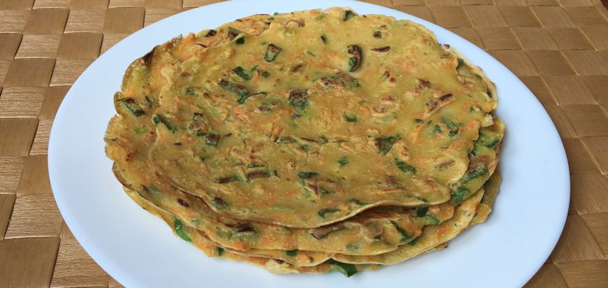 Amestecati toate ingredientele in afara de ulei intr-un bol si adaugati apa rece pana obtineti consistenta unui aluat moale (care curge). Ungeti o tigaie cu ulei si turnati compozitia cu un polonic, inclinand tigaia pentru a uniformiza aluatul. Coaceti la foc mediu, cate 40-50 secunde pe fiecare parte sau pana cand se rumenesc.