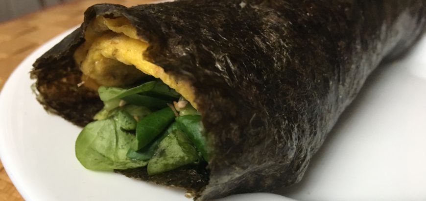 Se bate oul cu furculita, adaugand sare, o mana de patrunjel verde si ardeiul taiat felii. Incingeti o tigaie si apoi adaugati uleiul. Turnati oul si lasati-l timp de 1-2 minute pe o parte, apoi intoarceti omleta cu grija si lasati-o inca 1 minut. Luati omleta de pe foc. Puneti foaia de nori pe un fund de lemn si aranjati pe ea omleta, apoi avocado-ul taiat felii, frunzele de spanac si sosul de iaurt. Rulati rapid foaia, taiati-o in doua si consumati-o pana este calda, pentru a nu se usca.